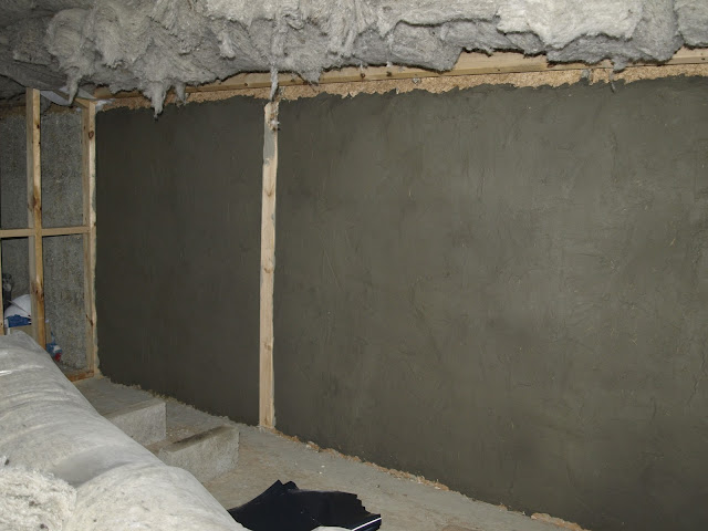 Some of the straw walls are going to be overboarded, for example behind the kitchen units, where we need to be able to fix cupboards etc. The plan this week is to clay plaster the walls that will be overboarded.